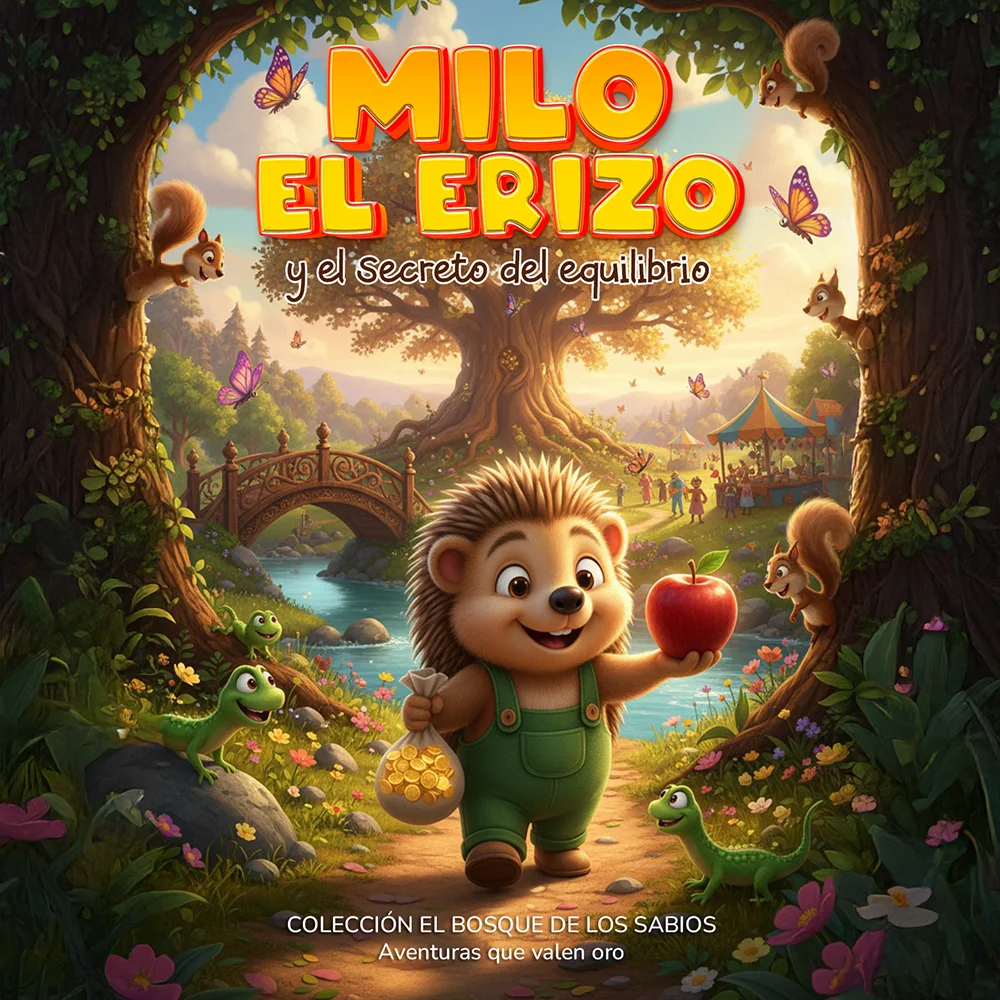 En el Bosque de los Sabios vivía Milo, un erizo curioso y trabajador. Un día descubrió un carrito de madera en la tienda del señor Castor y decidió conseguirlo trabajando sin descanso. Recolectó bayas hasta agotarse, pero pronto entendió que su tesoro no era solo juntar más, sino también cuidar de sí mismo. Con la ayuda del Sabio Búho y de sus amigos, Milo aprendió que la verdadera riqueza está en equilibrar el trabajo, el juego y el descanso.